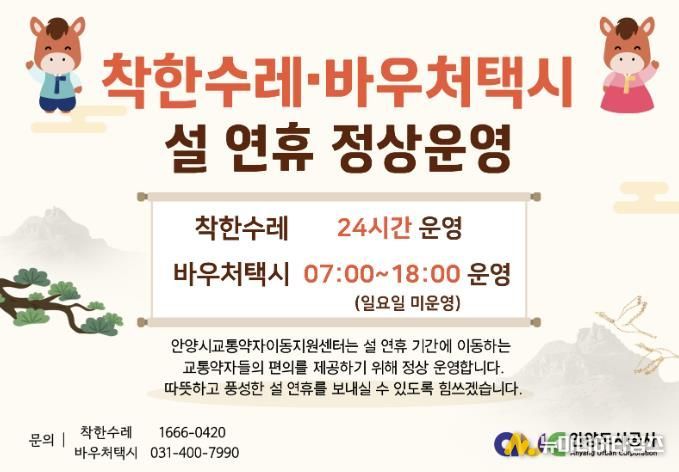 안양시는 2월 14일부터 18일까지 설 명절 연휴 기간에도 ‘착한수레’와 ‘바우처택시’를 정상 운영한다고 11일 밝혔다. 두 교통수단은 대중교통 이용이 어려운 장애인·임산부·영유아 등 교통약자의 병원 진료, 등·하교, 출·퇴근 등 일상 이동을 지원한다.