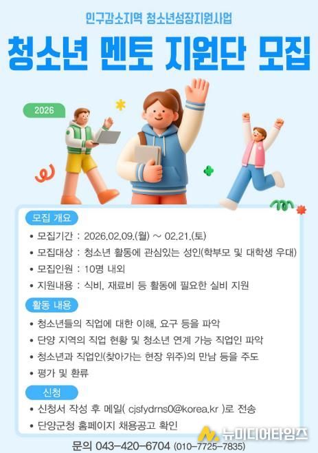 단양군청소년수련관은 인구감소지역 청소년성장지원사업의 일환으로, 청소년의 건강한 성장과 진로 탐색을 지원하기 위한 ‘청소년멘토지원단’을 모집한다고 밝혔다.