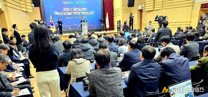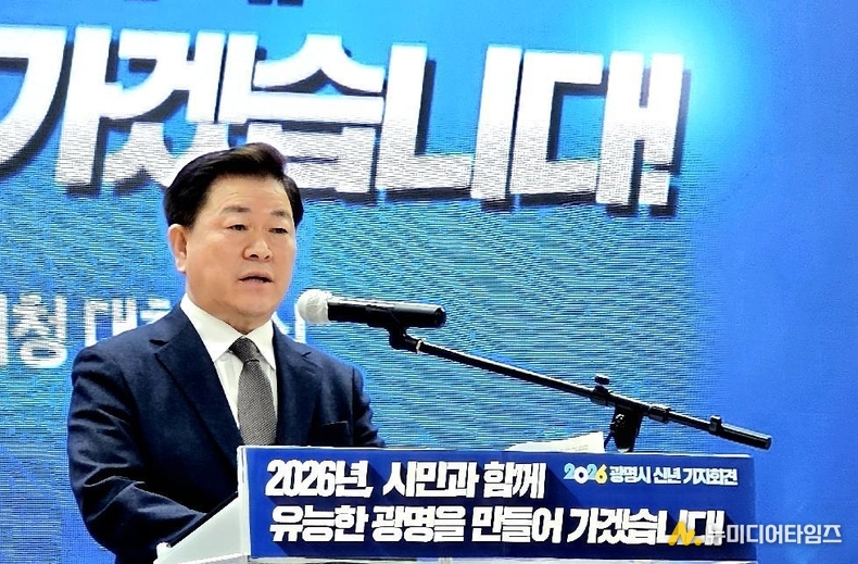 박승원 광명시장이 12일 오전 시청 대회의실에서 신년 기자회견을 열고 "2026년은 광명의 핵심 가치들을 유능한 시민과 함께 완성의 단계로 끌어올리는 해가 될 것"이라고 밝혔다.