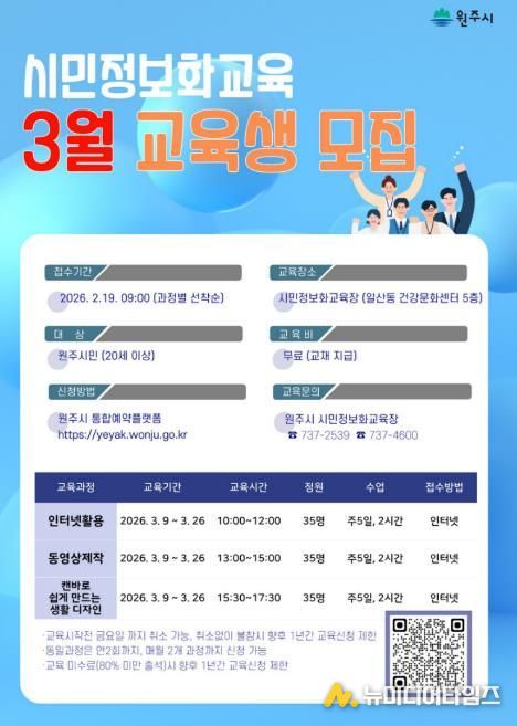 원주시는 시민들의 디지털 활용 능력 향상과 정보 격차 해소를 위해 시민정보화교육 3월 수강생을 모집한다.