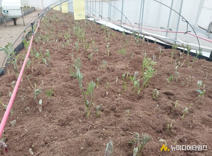 현재 농가에서는 지난해 11월 노지에서 굴취한 뿌리를 비닐하우스 내 재배상에서 15~17℃의 정밀한 온도 관리(촉성 재배)를 통해 생산하고 있다.