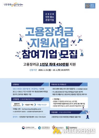 인천광역시와 인천관광공사(사장 유지상)는 지역 중·소 관광기업의 안정적인 인력 운영을 지원하고, 인천 거주 청년의 지속 가능한 일자리 창출을 위해'2026년 인천 중·소 관광기업 고용장려금 지원사업'을 추진한다고 밝혔다.