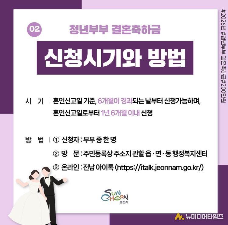 순천시는 청년세대의 결혼 초기 경제적 부담을 완화하고 안정적인 지역 정착을 지원하기 위해 '2026년 청년 부부 결혼축하금 지원사업'을 시행하고, 부부당 200만 원의 결혼축하금을 지급한다고 밝혔다.