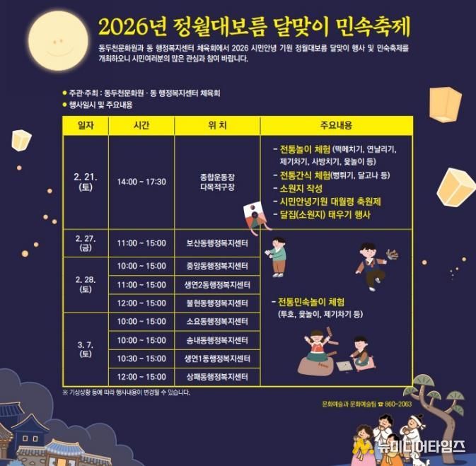 동두천시는 2026년 정월대보름(양력 3월 3일)을 맞아 동두천문화원과 각 동 체육회에서 2026년 정월대보름 달맞이 전통 민속행사를 개최한다고 밝혔다.