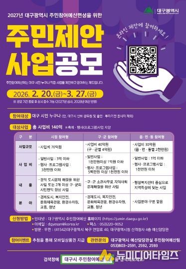 대구광역시는 시민의 목소리를 시정에 직접 반영하기 위해 2월 20일부터 3월 27일까지 36일간 ‘2027년도 예산편성을 위한 주민제안사업’을 공모한다.