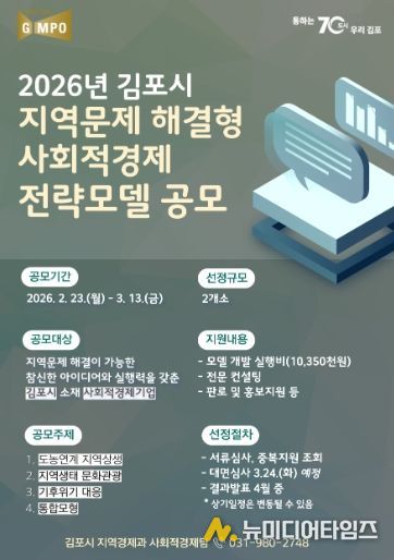 김포시는 사회적경제 기업이 주도하는 수익 창출형 지역문제 해결 모델을 육성하기 위해 ‘2026년 김포시 지역문제 해결형 사회적경제 전략모델’을 3월 13일까지 공모한다고 밝혔다.