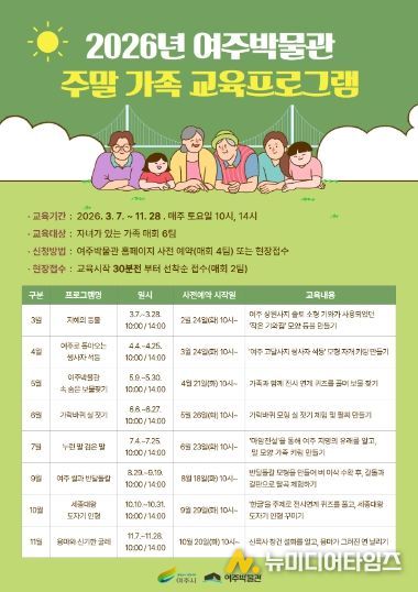 여주시 여주박물관은 오는 3월 7일부터 11월 28일까지 매주 토요일, 가족 단위 관람객을 대상으로 한 ‘2026년 주말 가족 대상 교육프로그램’을 운영한다.