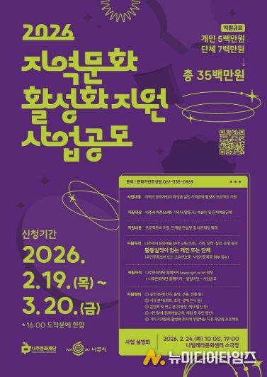 나주문화재단은 ‘2026 지역문화 활성화 지원사업’ 공모를 오는 3월 20일 오후 4시까지 진행한다고 19일 밝혔다.