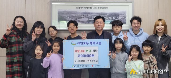 동네사람들 ‘영동탐험대’(대표 조유진)는 20일 영동읍 맞춤형복지팀에 직접 찾아와 우리 지역 어려운 이웃을 위해 사용해 달라며 성금 299,000원을 기탁했다.