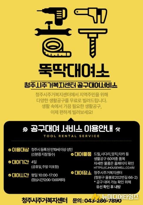 청주시는 청주시주거복지센터(청원구 율량동)에 마련한 공구대여소인 ‘뚝딱대여소’를 본격 운영해 생활밀착형 주거복지 행정을 펼친다고 20일 밝혔다.