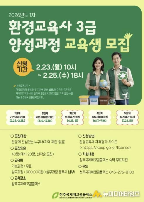 청주시환경교육센터(청주국제에코콤플렉스)는 ‘2026년 제1차 환경교육사 3급 양성과정’ 교육생을 모집한다고 20일 밝혔다.