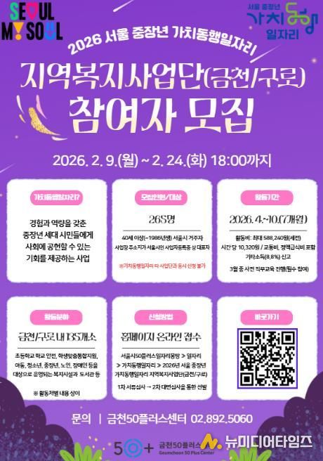 금천구는 금천50플러스센터에서 경험과 역량을 갖춘 중장년 세대들에게 지속적인 사회참여를 지원하기 위해 ‘2026년 서울 중장년 가치동행일자리사업’ 참여자를 모집한다고 밝혔다.