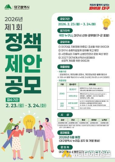 대구광역시는 전 국민과 시 산하 공무원의 창의적인 정책 아이디어를 발굴해 시정 발전의 동력으로 활용하고자 ‘2026년 제1회 정책제안 공모’를 개최한다.
