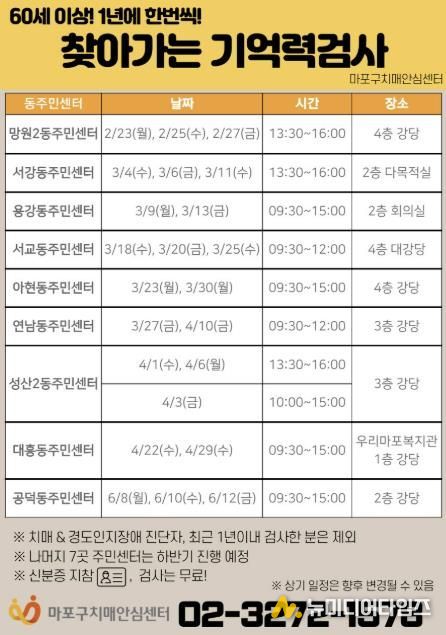 이번 검진은 마포구치매안심센터 전문 인력이 각 동 주민센터를 직접 방문해 진행하며, 60세 이상 마포구민이면 누구나 무료로 받을 수 있다.