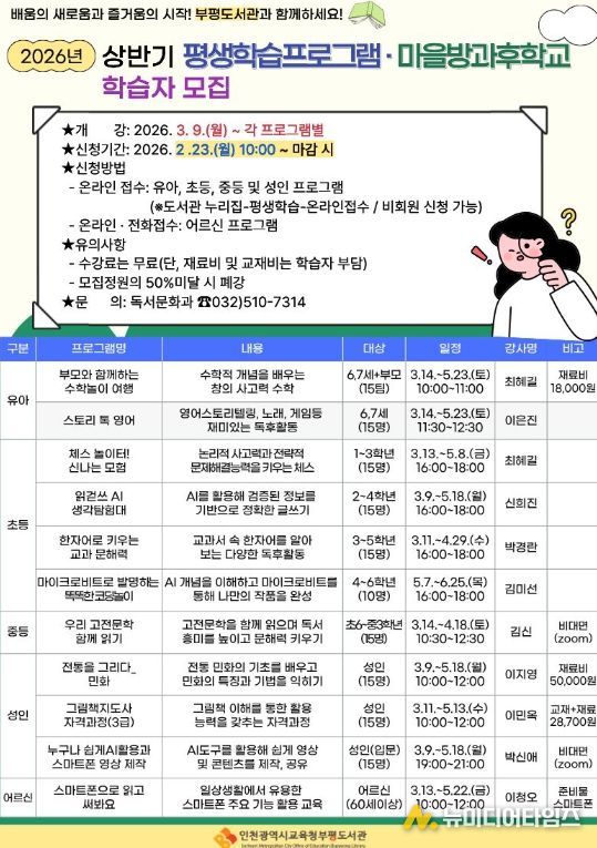 인천광역시교육청부평도서관은 지역 주민에게 배움의 즐거움을 전하고 성장의 기회를 제공하기 위하여, 23일부터 ‘상반기 정규 평생학습프로그램 및 마을방과후학교’학습자를 모집한다.