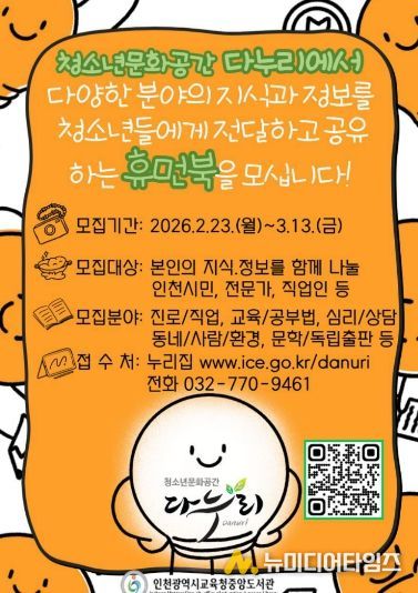 인천광역시교육청중앙도서관청소년문화공간 다누리는 2월 23일부터 3월 13일까지, 재능공유 플랫폼인 사람책 도서관 ‘휴먼 라이브러리’를 함께 이끌어갈 ‘휴먼북(사람책)’을 모집한다.