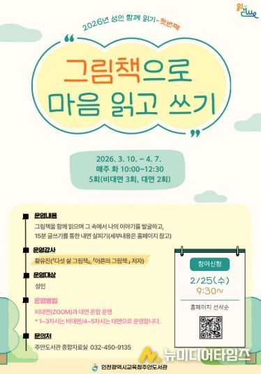 인천광역시교육청주안도서관은 오는 25일부터 관내 성인을 대상으로 그림책으로 자아를 탐색하는 ‘그림책으로 마음 읽고 쓰기’ 독서동아리 참여자를 모집한다.