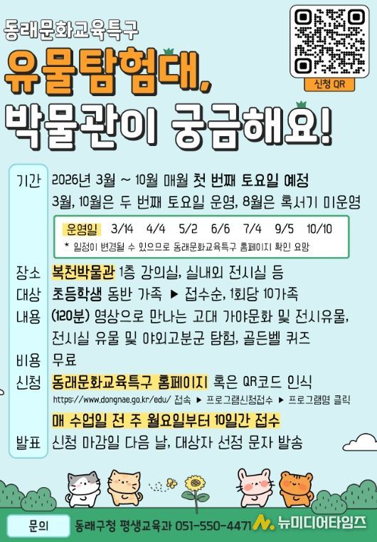 동래구 관계자는 “‘유물탐험대, 박물관이 궁금해요!’ 프로그램은 복천박물관 소속 강사진의 자세하고 흥미로운 해설과 함께 유물을 탐색하며 역사 속 이야기를 배우는 프로그램이다”라며 “호기심이 가득한 초등학생들이 우리 지역의 유물과 문화유산을 재밌게 탐구하고, 가족과 함께 뜻깊은 시간을 보내길 바란다”라고 말했다.