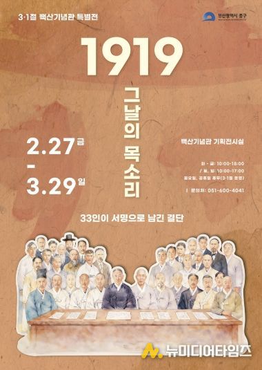 부산 중구는 제107주년 3·1절을 맞아 오는 2월 27일부터 3월 29일까지 백산기념관 기획전시실에서 '1919 그날의 목소리, 33인이 서명으로 남긴 결단'특별전을 개최한다.