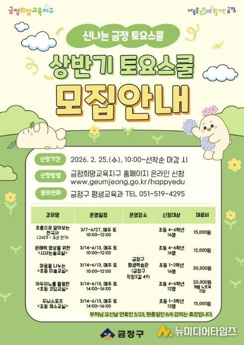 부산 금정구는 보호자(학부모 등)의 사교육비 부담을 줄이고 창의적인 미래 인재를 양성하기 위하여 매주 토요일 관내 초등학생을 대상으로 ‘2026 상반기 금정 토요스쿨’ 프로그램을 운영한다.