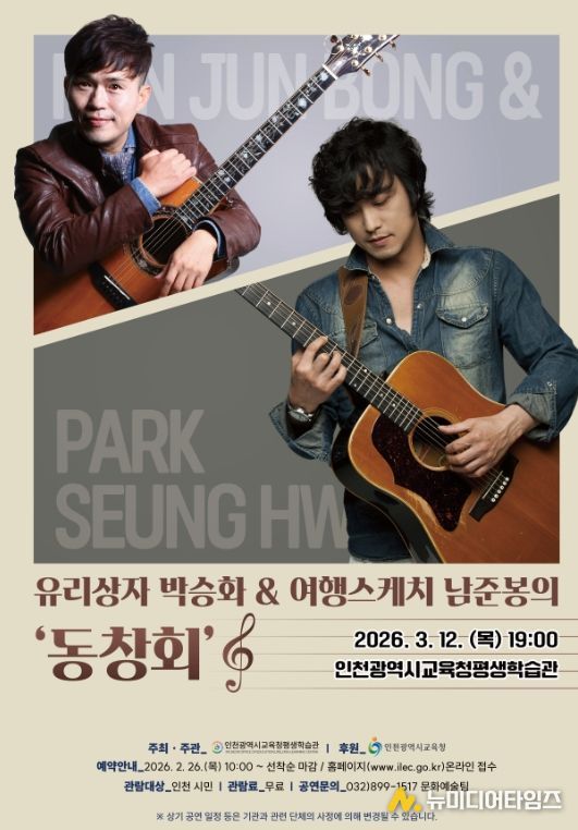 인천광역시교육청평생학습관은 시민의 다양한 문화예술 향유를 위하여, 3월 12일 교육누리홀에서 ‘유리상자 박승화 & 여행스케치 남준봉’ 음악 공연을 개최한다.