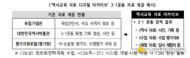 또한, 학생의 탐구 역량을 키우는 역사 수업 활성화를 위해 ‘탐구 중심 역사 교육과정 운영 사례집’(’26. 3종→’27. 9종)을 개발·보급한다. 더불어, 각종 기관·누리집(플랫폼) 등에 분산된 근현대 사료와 교육자료, 체험 자료 등을 수업에 즉시 활용할 수 있도록 교사에게 묶음(패키지) 형태로 제공하는 ‘역사교육 자료 아카이브’를 구축(ʹ27)할 예정이다.