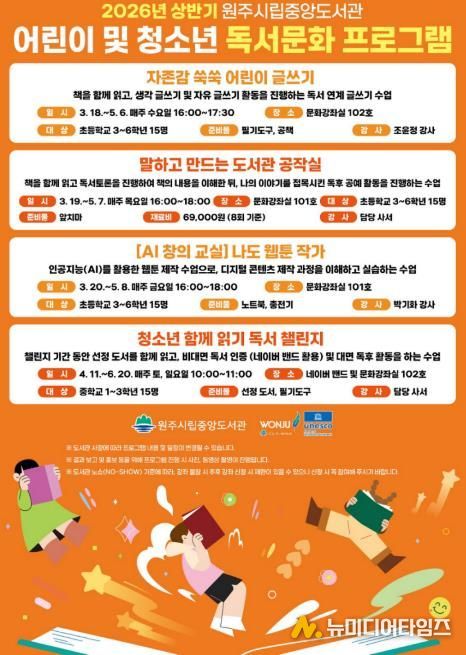 원주시립중앙도서관은 오는 3월부터 6월까지 ‘2026년 상반기 어린이 및 청소년 독서문화 프로그램’을 운영한다.