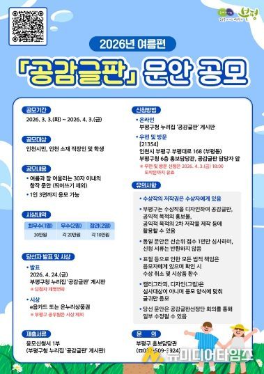 부평구가 3월 3일부터 4월 3일까지 한 달간 ‘2026년 여름편 공감글판’ 문안을 공모한다.