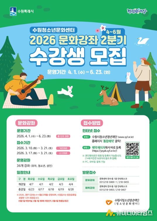 수원시청소년청년재단(이사장 최종진) 수원청소년문화센터가 오는 4월부터 시작되는 ‘2026년 2분기 문화강좌’ 수강생을 모집하며, 시민들의 일상을 풍요로운 배움으로 채울 준비를 마쳤다.