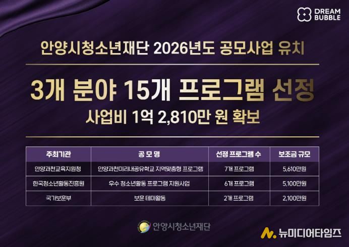 안양시청소년재단은 2026년 국가 및 공공기관, 교육청 등이 추진하는 주요 공모사업 3개 분야에서 15개 프로그램이 선정되어 총 1억 2,810만 원 규모의 사업비를 확보했다고 3일 밝혔다.