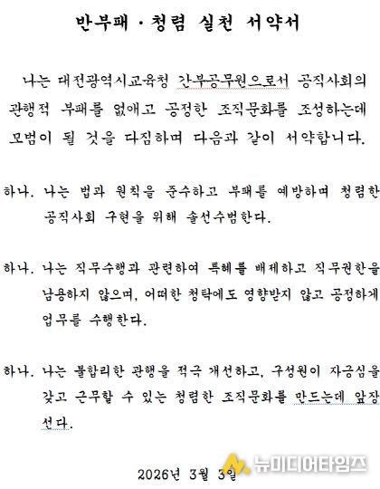 대전시교육청은 3월 3일, 시교육청 6층 중회의실에서 고위직 공무원을 대상으로 투명하고 공정한 조직문화 조성을 위한 ‘청렴 실천 서약’을 실시했다고 밝혔다.
