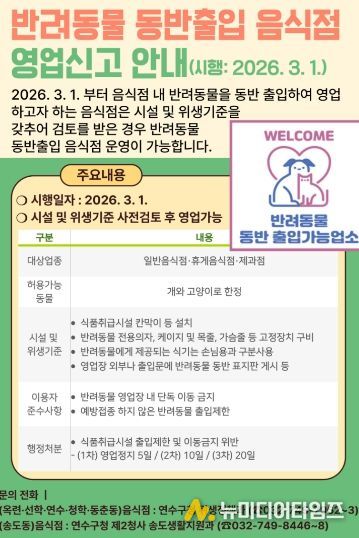 연수구는 3월부터 반려동물을 동반한 손님도 일반음식점, 휴게음식점, 제과점 등을 이용할 수 있다고 밝혔다.
