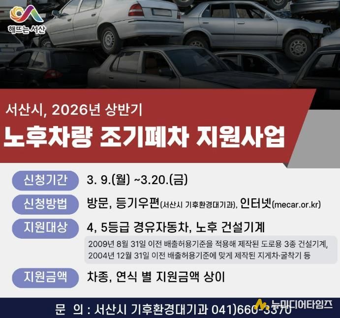 충남 서산시가 청정한 대기환경을 조성하기 위해 2026년 노후차량 조기폐차 지원사업을 추진한다고 밝혔다.