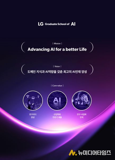 엘지(LG) 에이아이(AI) 대학원은 지난해 1월 제도가 시행된 이후, 교육부의 인가를 받아 설치된 최초의 사내대학원으로 인공지능학과 석사(입학정원 25명) 및 박사(입학정원 5명) 학위과정을 운영한다. 교육 비전은 ‘도메인(domain)* 지식과 인공지능 역량을 갖춘 최고의 인공지능 인재 양성’으로, △산업 밀착형 인공지능(AI) 실무 인재 △글로벌 기술혁신 선도 인공지능(AI) 연구 리더 △인공지능(AI) 연구와 사업화를 연결하는 인재를 체계적으로 육성함을 목표로 한다.
