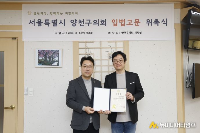 양천구의회는 4일 오전 의장실에서 홍선기 교수를 입법고문으로 공식 위촉했다. 이번 위촉은 자치입법 역량을 강화하고 전문적인 법률 자문 체계를 확립하기 위한 것으로, 위촉 기간은 2026년 3월 1일부터 2028년 2월 28일까지 2년간이다.