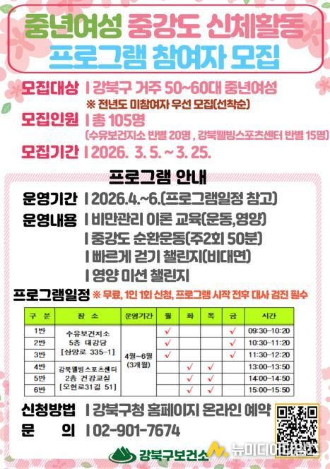 모집 대상은 강북구에 거주하는 1956~1976년생 여성 총 105명이다. 참여 신청은 5일부터 25일까지 강북구청 홈페이지 통합예약 시스템을 통해 선착순으로 진행된다. 프로그램은 4월 1일부터 6월 30일까지 12주간 운영되며, 수유보건지소와 강북웰빙스포츠센터에서 6개 반으로 나뉘어 주 2회, 회당 50분씩 중강도 운동을 실시한다.