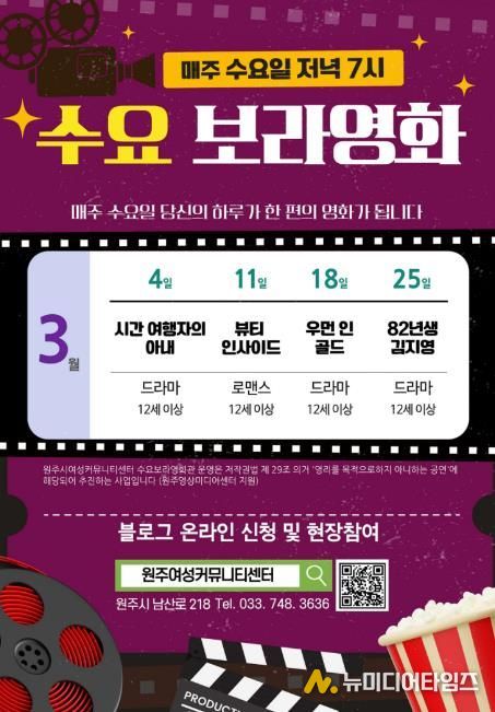 원주시여성커뮤니티센터는 여성의 역량 강화와 지역 내 소통 활성화를 위해 매달 다양한 프로그램을 운영하고 있다. 특히 매주 수요일 저녁 7시 진행되는 ‘수요보라영화관’은 시민들에게 큰 호응을 얻고 있다.