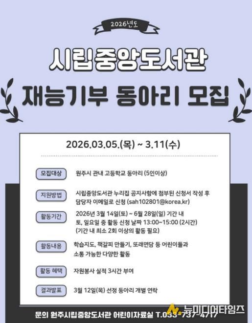 원주시립중앙도서관은 올해 상반기 청소년 재능기부 동아리 봉사활동에 참여할 관내 고등학교 동아리 학생들을 모집한다.