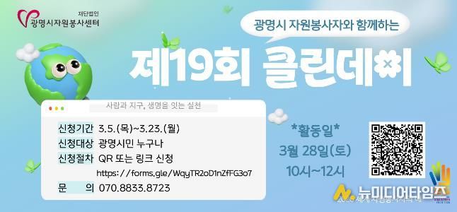광명시자원봉사센터는 오는 3월 28일 자원봉사 단체․활동처 및 광명 시민이 함께 광명시 전역에서 환경정화 활동을 펼치는‘제19회 광명시 자원봉사자와 함께하는 클린데이’를 진행한다고 밝혔다.