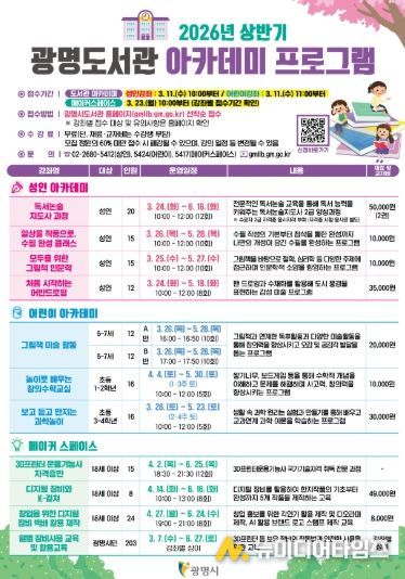 서준희 광명도서관장은 “이번 상반기 아카데미 프로그램은 시민 누구나 배움과 독서를 일상에서 누릴 수 있도록 마련한 종합 평생학습 과정”이라며 “앞으로도 광명도서관이 시민의 성장과 도전을 지원하는 열린 평생학습공간으로 자리매김할 수 있도록 적극 지원하겠다”고 말했다.