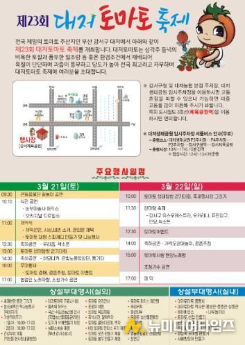 부산 강서구의 대표적 특산물인 대저 토마토(짭짤이 토마토)를 홍보하는 대저 토마토 축제가 오는 3월 21일부터 양일간 강서체육공원 광장과 보조체육관에서 열린다.
