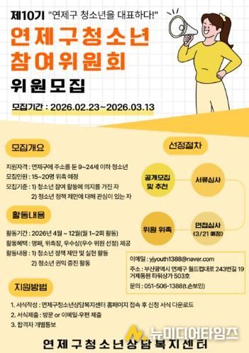 연제구청소년상담복지센터는 오는 3월 13일까지 '2026년 제10기 연제구청소년참여위원회' 위원을 공개 모집한다.