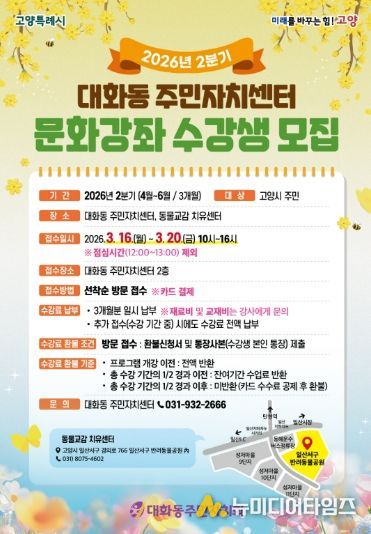 고양특례시 일산서구 대화동 주민자치회는 주민들의 문화적 욕구를 충족하고 삶의 질을 높이기 위해 오는 3월 16일부터 20일까지 ‘2026년 2분기 문화강좌’ 수강생을 모집한다.