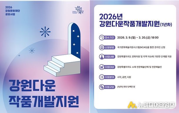 강원문화재단은 강원을 대표할 창작 콘텐츠 발굴을 위해 '2026 강원다운작품개발지원사업(1년차)' 공모 접수를 9일부터 시작한다.