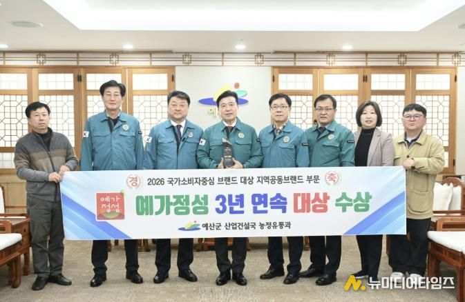 예산군 농특산물 공동브랜드 ‘예가정성’이 브랜드 인지도와 선호도 측면에서 소비자에게 높은 평가를 받아 3년 연속 ‘2026 국가 소비자중심 브랜드(지역공동브랜드 부문) 대상’을 수상했다.
