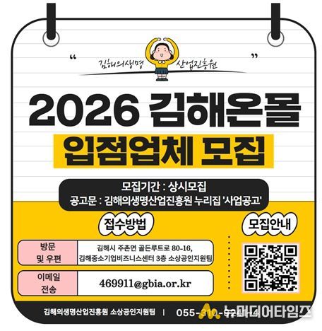 한편, 입점 신청은 김해의생명산업진흥원 누리집 ‘사업공고’를 통해 확인 가능하며, 자세한 사항은 진흥원 소상공인지원팀으로 문의하면 된다.
