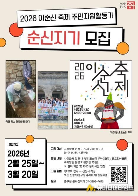 이순신 장군의 탄생지 서울 중구가 4월에 있을 <2026 이순신 축제>에서 활약할 주민자원활동가 ‘순신지기’와 ‘중구 소년 이순신’을 선발한다.