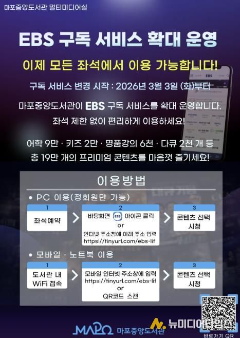 마포구 구립도서관인 마포중앙도서관은 이용자에게 편리하고 폭넓은 영상자료 서비스를 선보이기 위해 2026년 3월부터 ‘EBS Play+ 구독 서비스’를 확대 운영한다.