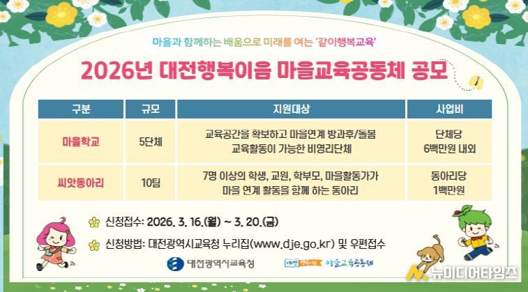 대전시교육청은 마을과 학교가 협력하는 교육생태계 조성을 위해 ‘2026년 마을교육공동체 마을학교 및 씨앗동아리’를 공모한다고 밝혔다.