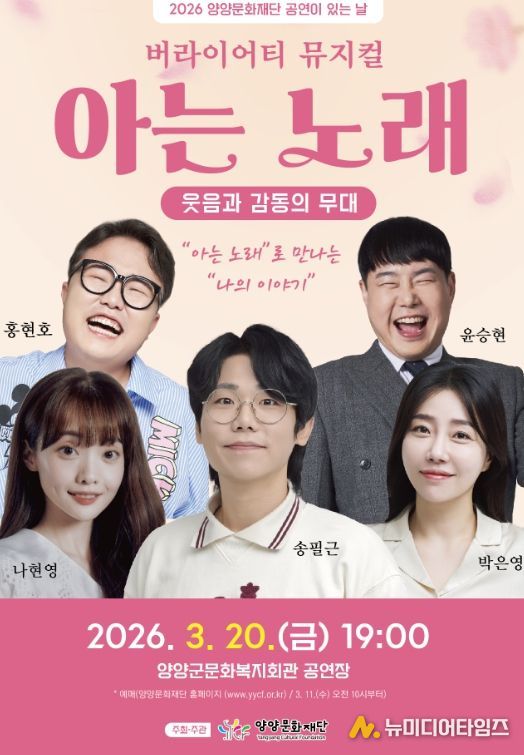 (재)양양문화재단이 2026년 새해 첫 공연으로 온 가족이 함께 웃고 즐길 수 있는 개그 뮤지컬 '아는 노래'를 오는 3월 20일 오후 7시 양양군 문화복지회관 공연장에서 개최한다.
